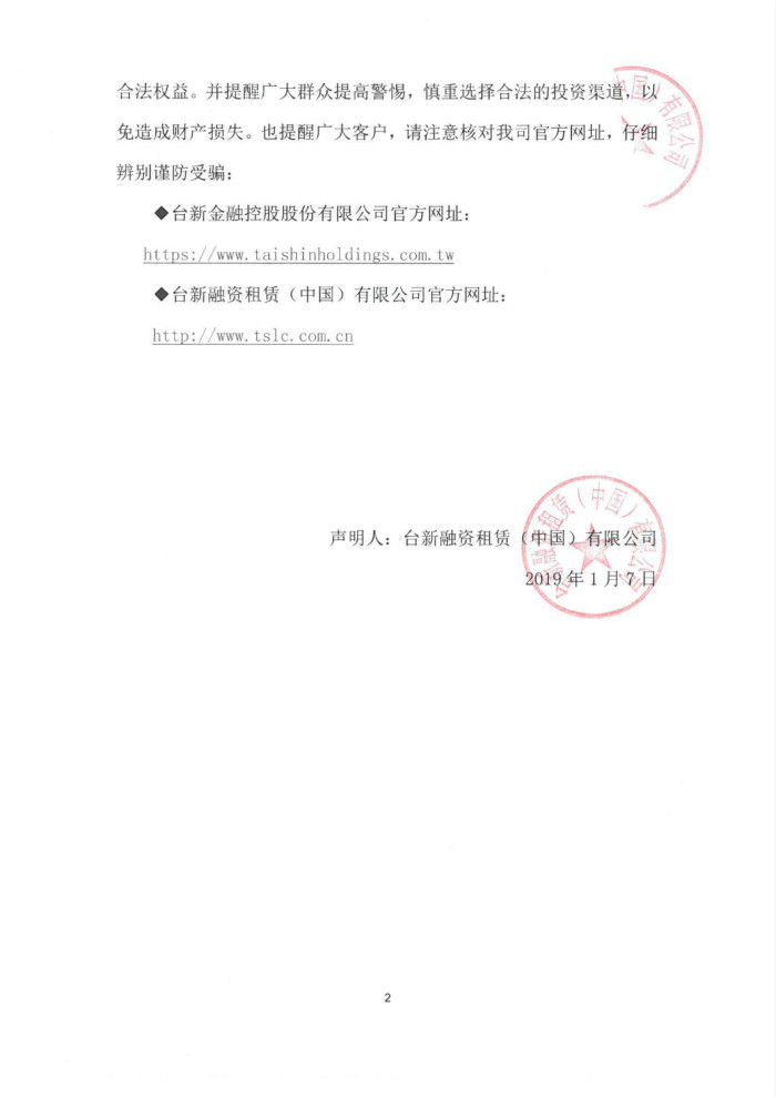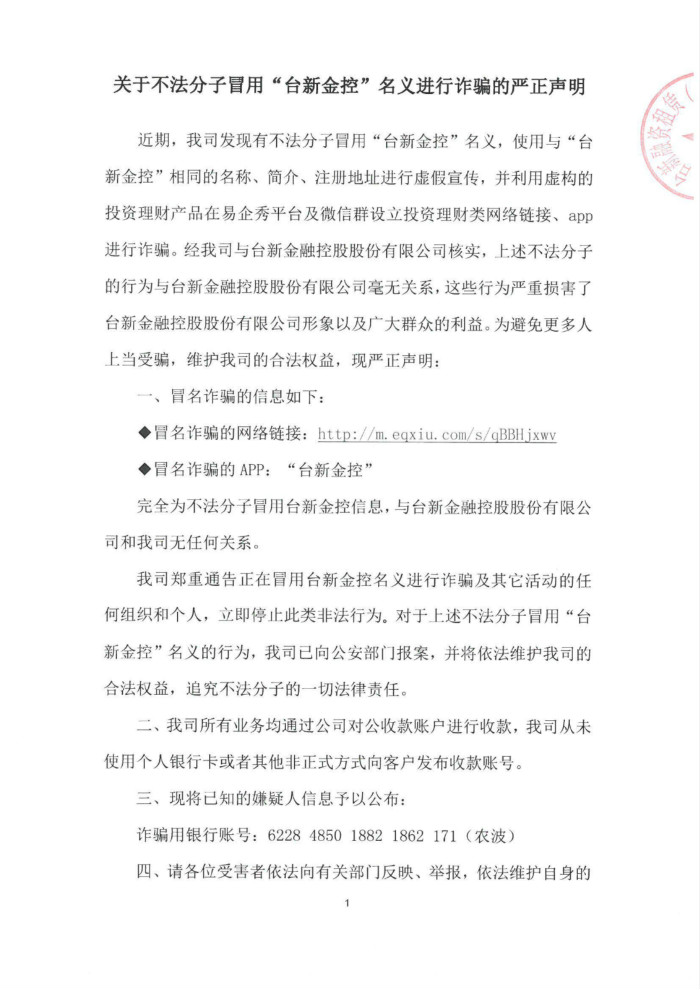 近期,我司发现有不法分子冒用集团母公司“台新金控”名义,使用与“台新金控”相同的名称、简介、注册地址进行虚假宣传,并利用虚构的投资理财产品在易企秀平台及微信群设立投资理财类网络链接、app进行诈骗。不法分子的上述行为不仅严重损害我司及台新金控商誉外,更是蓄意欺诈,涉嫌刑事犯罪。在此,我公司对此等不法行为予以强烈谴责,发布如下声明: